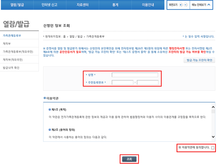 성명과 주민등록번호를 입력하고 이용약관에 동의를 체크후 조회버튼을 누릅니다.