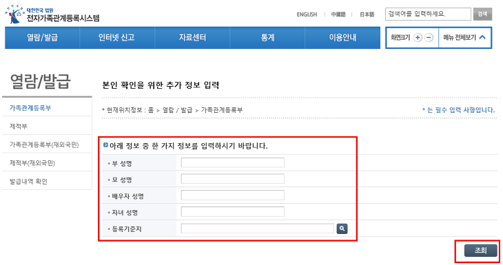 부모님 성명, 배우자성명, 자녀성명, 등록기준지 중 하나만 입력한 후 조회버튼을 누릅니다.