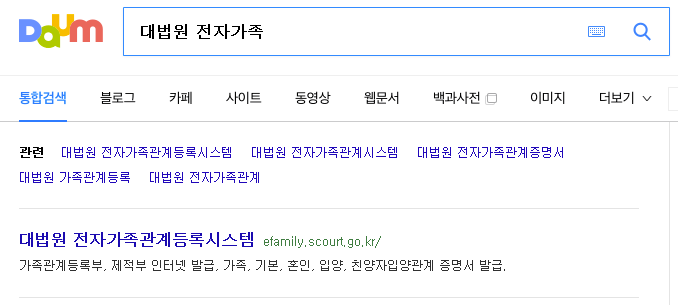 네이버 및 다음 등의 포털사이트에 '대법원 전자가족등록시스템' 을 입력 후 검색된 홈페이지로 접속합니다.