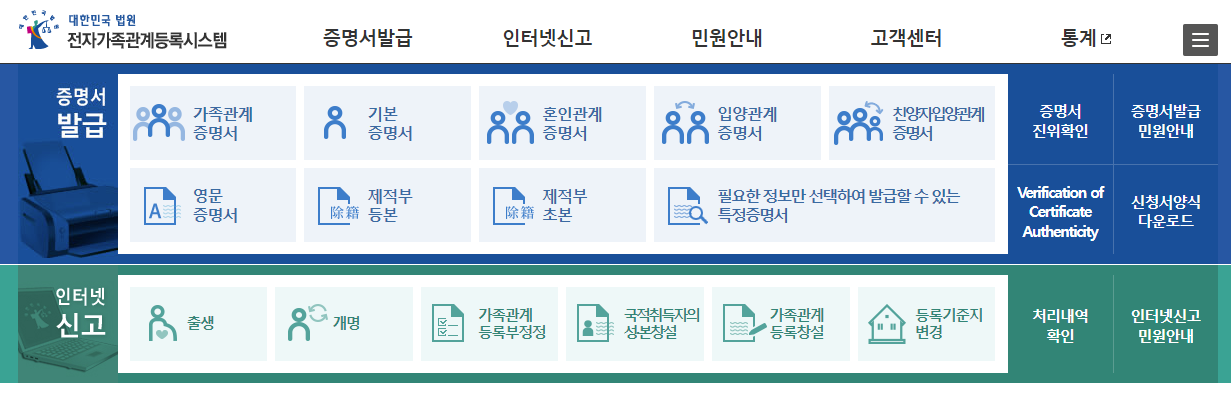 대법원 전자가족관계등록시스템에 접속하면 위와 같이 증명서 발급 메뉴가 화면 상단부에 뜨게 됩니다.