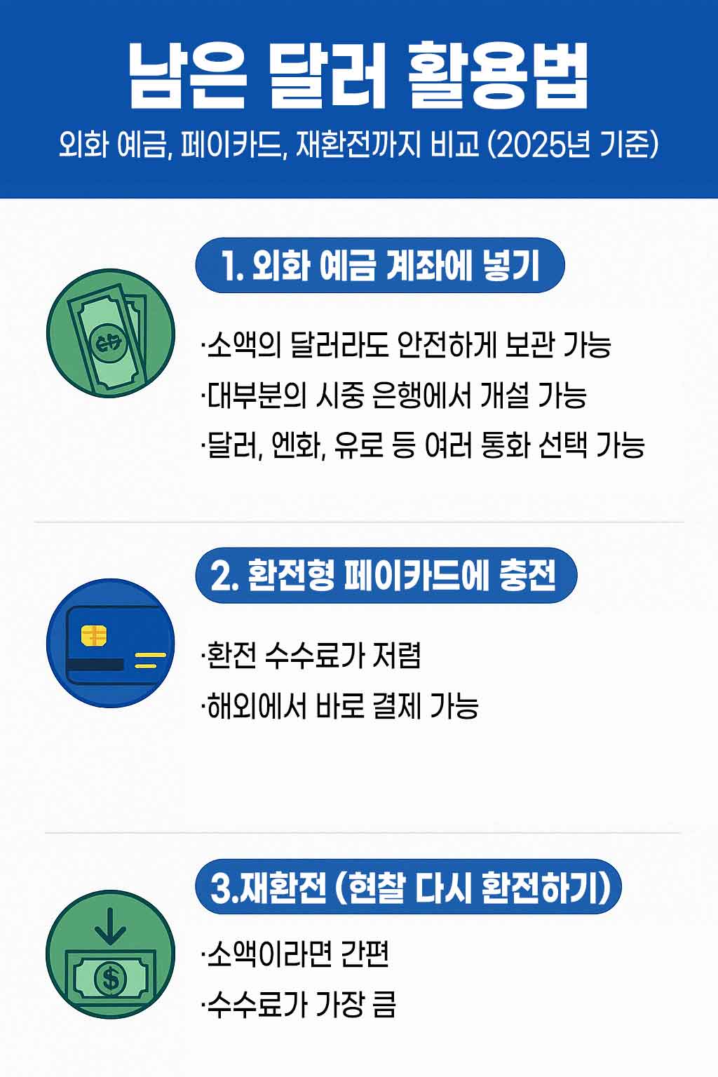 남은 달러 활용법 | 외화 예금, 페이카드, 재환전 비교 (2025년 기준)