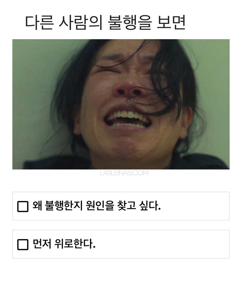 다른 사람의 불행을 봤을 때 원인보다는 위로를 먼저 할 것 같네요.