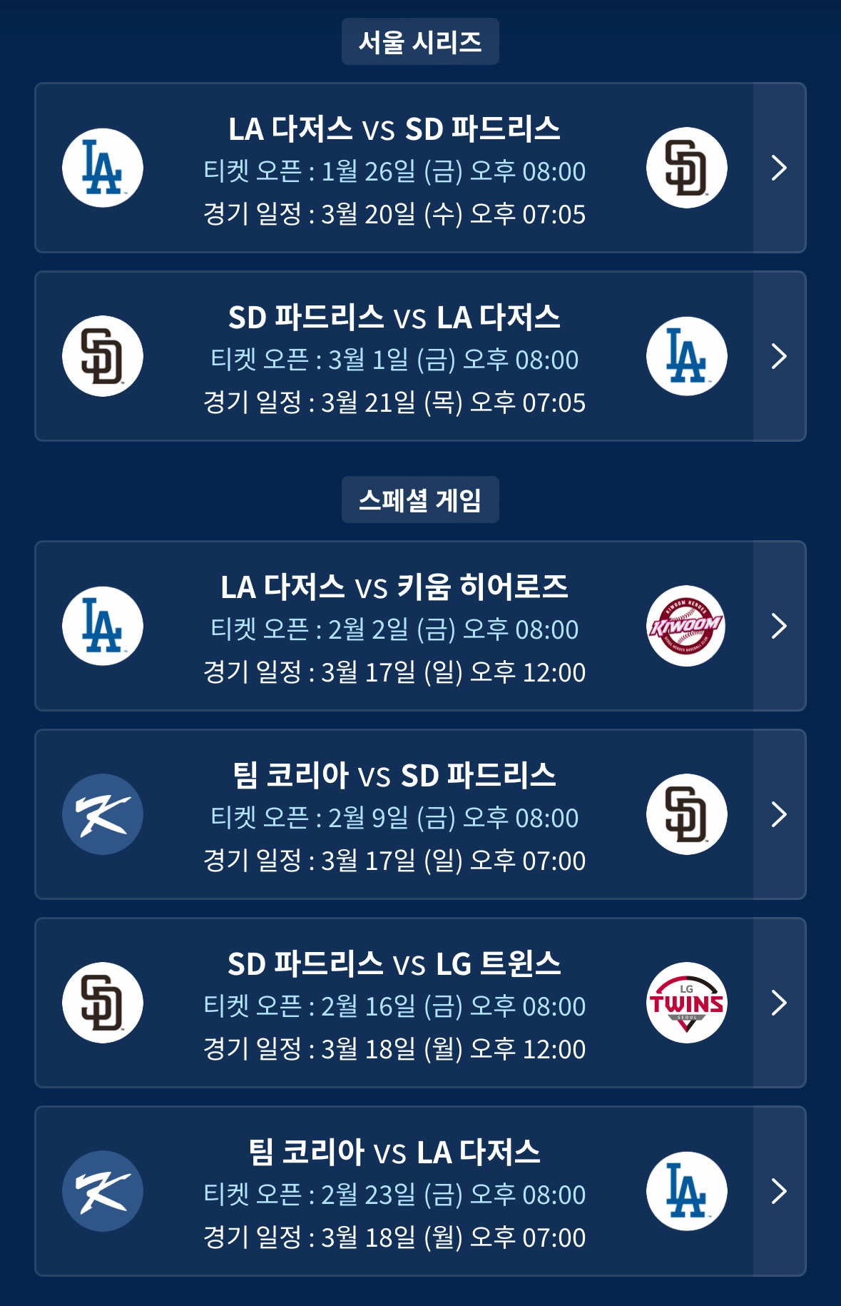카테고리 없음 메이저리그 한국투어 MLB 월드투어 서울 시리즈 경기 티켓 예매 일정 정보 - 반응형 안녕하세요 레이나입니다.드디어 MLB 월드투어 서울시리즈의 티켓 예매 상세 일정이 나와 알려드리려고 합니다! 총 6경기가 펼쳐질 예정이며 예매 일정이 상이하니 꼭 확인하셔야겠습니다.MLB 월드투어 서울시리즈 포스터 MLB 월드 투어 서울 시리즈 경기 티켓 예매 일정 쿠팡 플레이 예매 일정 이미지 1월 26일 금요일부터 첫 경기 예매가 시작되며 2월 23일까지 총 6경기 예매가 진행됩니다.예매처는 쿠팡 플레이이며 쿠팡와우 회원만 예매 가능한 점 확인해 주세요!좌석과 티켓 가격 등의 자세한 정보는 쿠팡 플레이에서 추후 확인 가능합니다, https://www.coupangplay.com/promotion/mlb-seoul-series/ MLB 월드투어 서울 시리즈 2024 | 쿠팡플레이2024년 3월, 쿠팡플레이와 함께하는 LA다저스와 샌디에이고 파드리스의 MLB 월드투어 서울 시리즈가 개최됩니다. 경기 일정, 티켓 예매 일정 등 상세 내용을 확인해보세요.www.coupangplay.com 🗓서울 시리즈 예매 일정LA 다저스 vs SD 파드리스 티켓 오픈 : 1월 26일 (금) 오후 8시경기 일정 : 3월 20일 (수) 오후 7시 5분SD 파드리스 vs LA 다저스티켓 오픈 : 3월 1일 (금) 오후 8시경기 일정 : 3월 21일 (목) 오후 7시 5분서울 시리즈 예매는 1월 26일 금요일과 3월 1일 금요일 오후 8시입니다.🗓 스페셜 게임 예매 일정 스페셜 매치는 국가대표팀 팀 코리아, LG 트윈스, 키움 히어로즈 총 3팀과 메이저리그의 LA 다저스, SD 파드리스와의 경기입니다.LA 다저스 vs 키움 히어로즈티켓 오픈 : 2월 2일 (금) 오후 8시경기 일정 : 3월 17일 (일) 오후 12시팀 코리아 vs SD 파드리스티켓 오픈 : 2월 9일 (금) 오후 8시경기 일정 : 3월 17일 (일) 오후 7시SD 파드리스 vs LG 트윈스티켓 오픈 : 2월 16일 (금) 오후 8시경기 일정 : 3월 18일 (월) 오후 7시팀 코리아 vs LA 다저스티켓 오픈 : 2월 16일 (금) 오후 8시경기 일정 : 3월 18일 (월) 오후 7시MLB 월드 투어의 모든 예매 일정이 나왔습니다.티켓의 가격 및 좌석 배치도는 추후에 공개될 것 같네요.모두 원하시는 경기 티켓팅 일정 잘 확인하시고 티켓팅 성공하시길 바랍니다😀 👇👇 같이 보면 좋은 정보 👇👇 메이저리그 MLB 한국 개막전 서울 시리즈 날짜 개최 장소 예매 방법 메이저리그 MLB 한국 개막전 서울 시리즈 날짜 개최 장소 예매 방법야구팬들에게 반가운 소식이 있어 전해드리려고 합니다! 한국의 김하성 선수의 샌디에이고 파드리스, 일본의 오타니 선수의 LA 다저스의 경기를 직접 볼 수 있는 기회가 생겼는데요. 바로 미국 lasleinas.com MLB 서울 시리즈 특별 대진팀 공개 예매 일정 소식 MLB 서울 시리즈 특별 대진팀 공개 예매 일정 소식얼마 전에 MLB 사상 최초로 한국에서 열리는 MLB 개막전 소식 알려드렸었는데요. LA다저스 VS 샌디에이고 파드리스의 2연전과 더불어 스페셜 경기도 있다고 합니다. 어느 팀이 스페셜 경기에 나설lasleinas.com 반응형 공유하기 게시글 관리 레이나’S 정보채널 Contents 댓글 0 + 이전 댓글 더보기