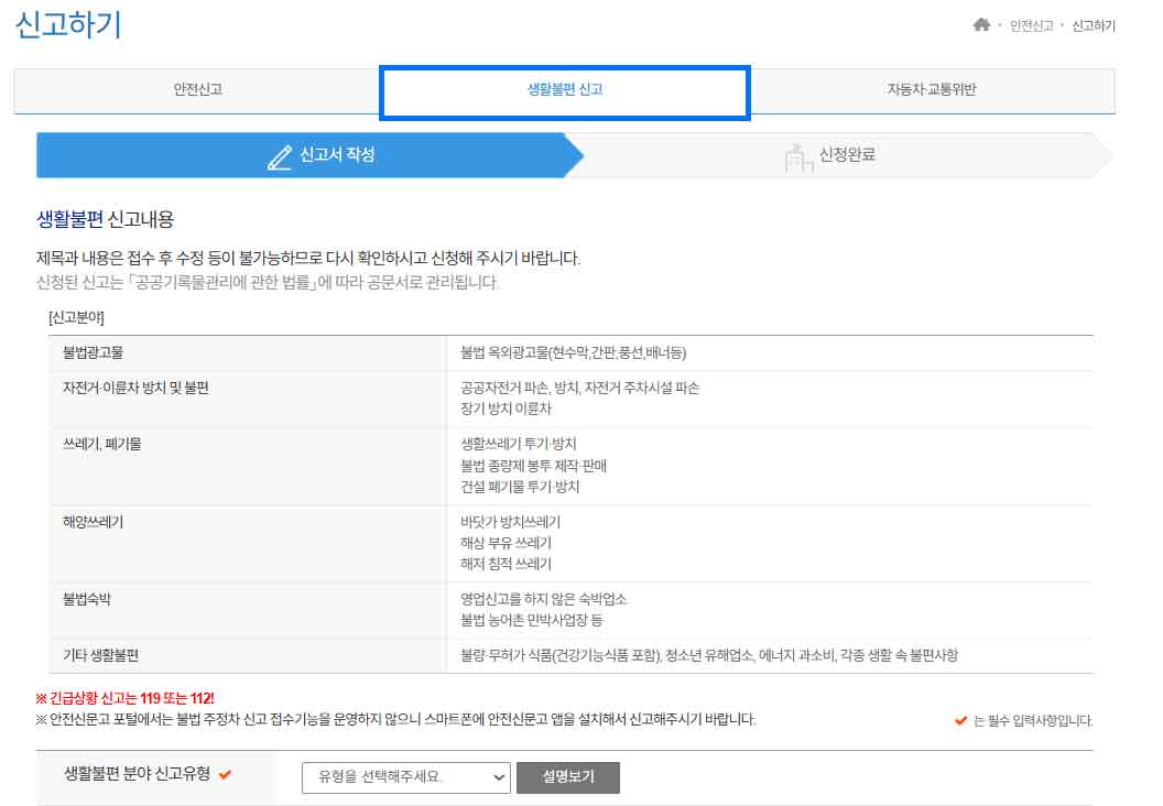 안전신문고 사이트에서 신고 방법 [안전신고] 선택 후 '생활불편 신고' 항목 선택