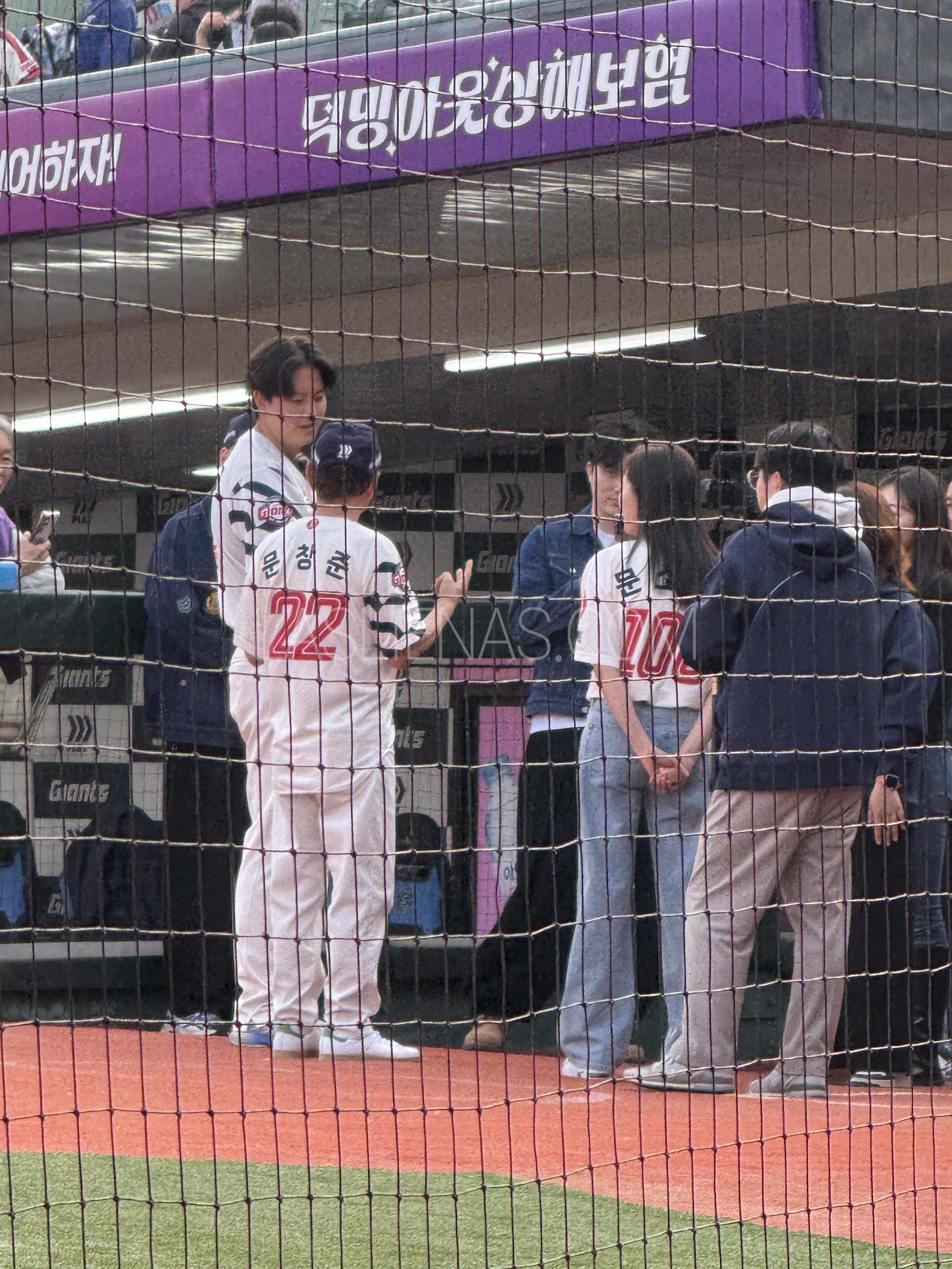 또 제가 방문한 4월 10일은 넷플릭스 인기 드라마 '폭삭 속았수다' 배우 문소리와 아버지가 함께 시구하는 날이였어요. 경기 전 김원중 선수와 얘기하는 모습도 보였답니다.
