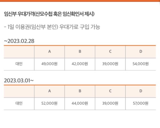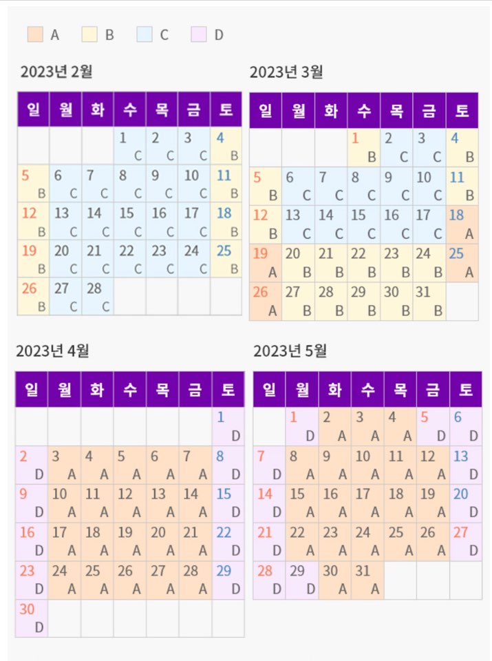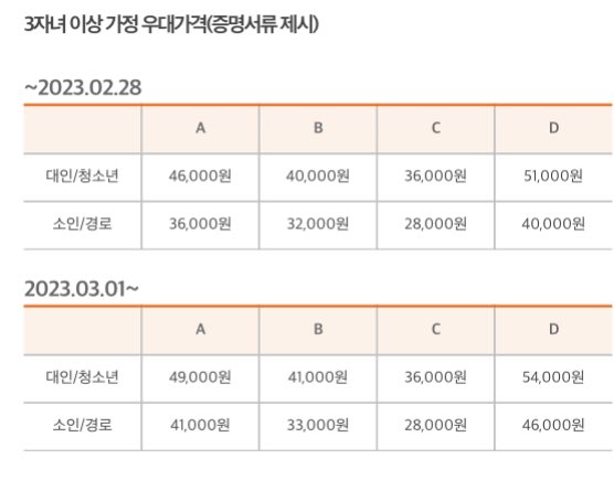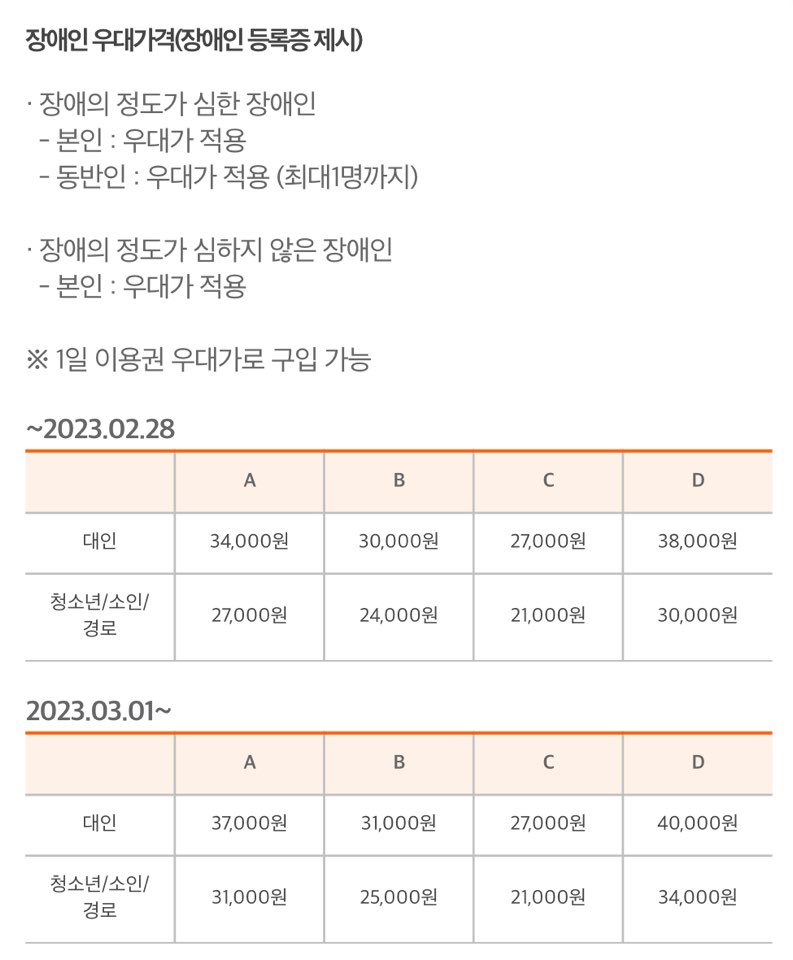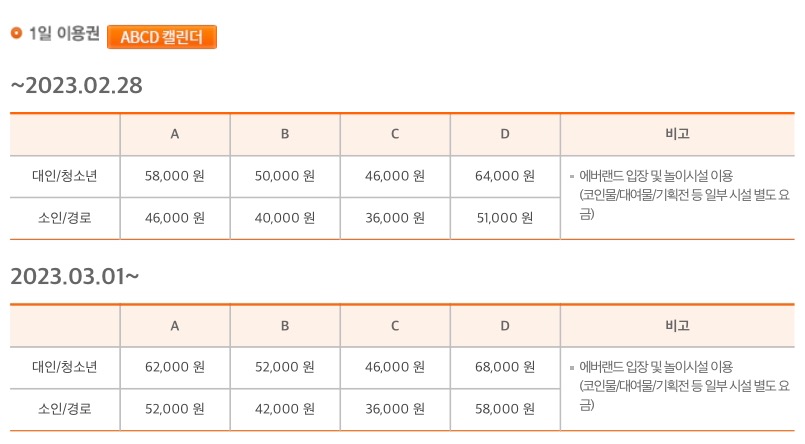 에버랜드 1일 이용권 요금입니다. 2023년 3월 1일부터 가격이 오른다고 하네요. 가격 표를 보게 되면 A,B,C,D로 나뉘어 있는데요. 이것은 시즌과 요일별 가격을 구별해 놓은 것입니다. A와 D 구간에는 비교적 가격이 비싼 주말 B와 C 구간은 평일로 가격은 조금 낮은 편이네요. 아마 방문자가 많은 시즌과 요일별로 가격을 나눈 듯합니다. 자세한 내용은 아래의 링크 접속 후 캘린더와 가격을 확인하시고 구매하세요.