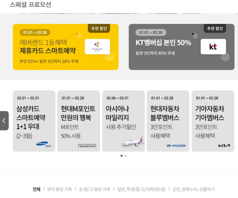 에버랜드 이용권을 제휴카드로 구매시 기존 가격 대비 50%할인을 제공해 주고 있습니다. 그렇기 때문에 다른 프로모션보다 할인 받을 수 있는 제일 좋은 방법 중 하나입니다. 내가 가지고 있는 카드 중 할인 조건에 맞는 카드를 이용해보세요. 확인은 아래 링크를 통해 자세히 확인 가능합니다.