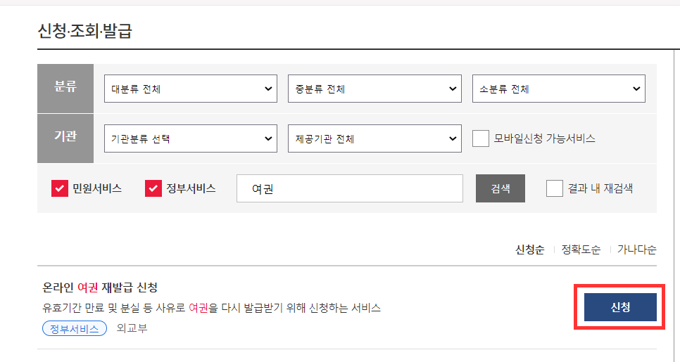 신청/조회/발급의 화면에서 여권을 검색하여 온라인 여권 재발급 신청 항목의 신청 버튼을 눌러주세요.