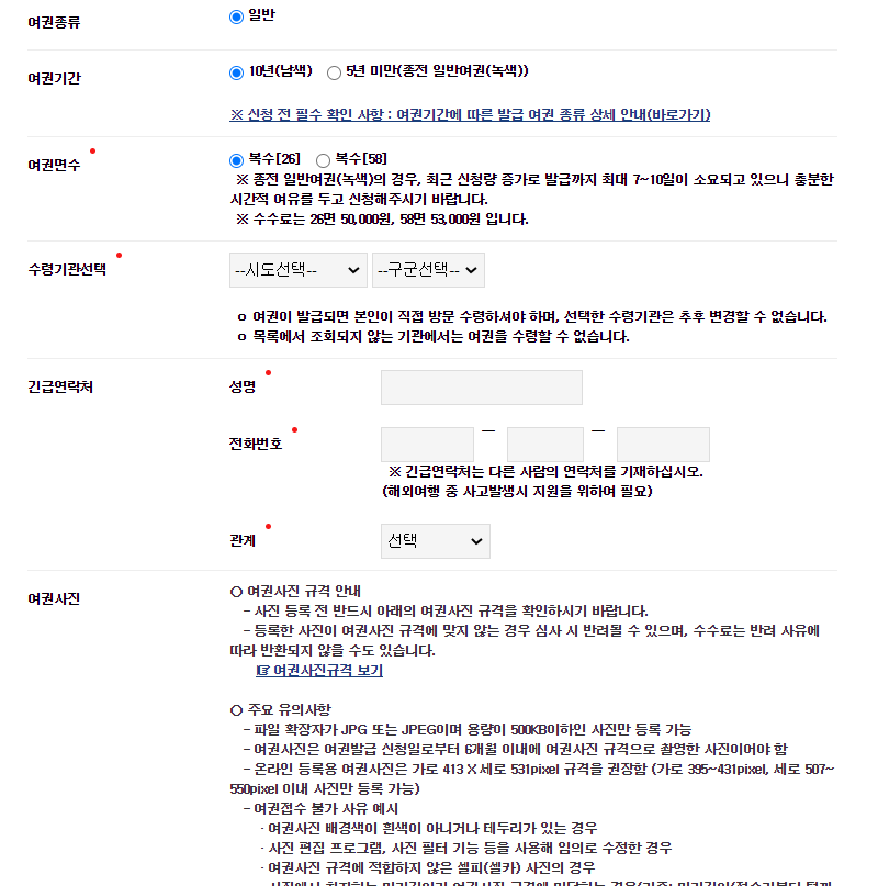 개인 정보 입력 후 여권 기간과 원하는 여권 장 수를 선택하고 수령 방문 장소 지정 등 필요한 정보를 입력해 주세요. 마지막으로 수수료를 결제하면 되는데 카드, 계좌이체 등 가능합니다. 이렇게 모든 절차가 끝나면 접수증을 출력하여 수령 희망기관 선택 후 신분증과 함께 방문하면 됩니다.