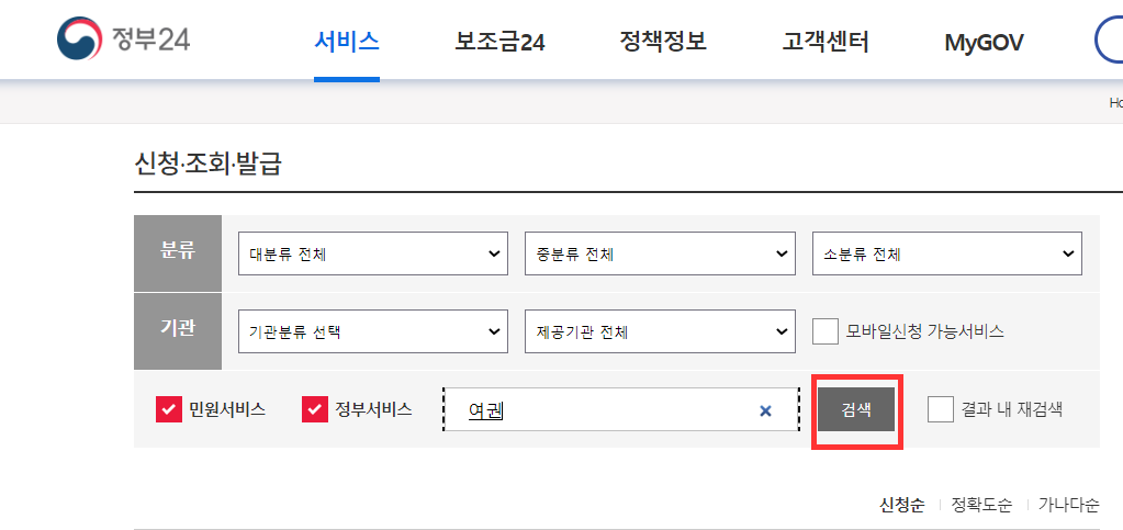 먼저 발급기관인 정부 24에 접속하여 상단의 서비스- 민원신청- 신청/조회/발급을 클릭합니다.