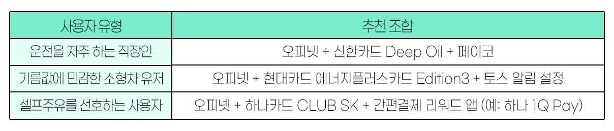 - 셀프주유 선호 ➡ 오피넷 + 하나카드 CLUB SK + 간편 결제 리워드 앱 (예: 하나 1Q Pay)