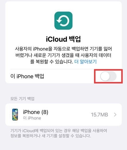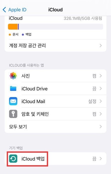 3. 아래로 스크롤하여 [iCloud 백업]을 찾아 탭 합니다.