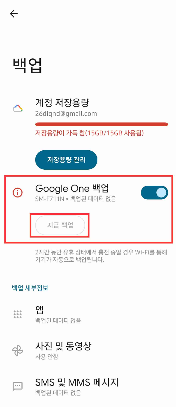 계정 및 백업에서 구글 계정을 탭할 후 사용 설정에 들어가 Google One 백업을 눌러 지금 백업을 눌러줍니다.
