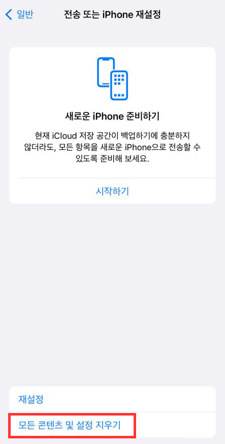 2. [전송 또는 iPhone 재설정]에 들어가 [모든 콘텐츠 및 설정 지우기]를 누릅니다.