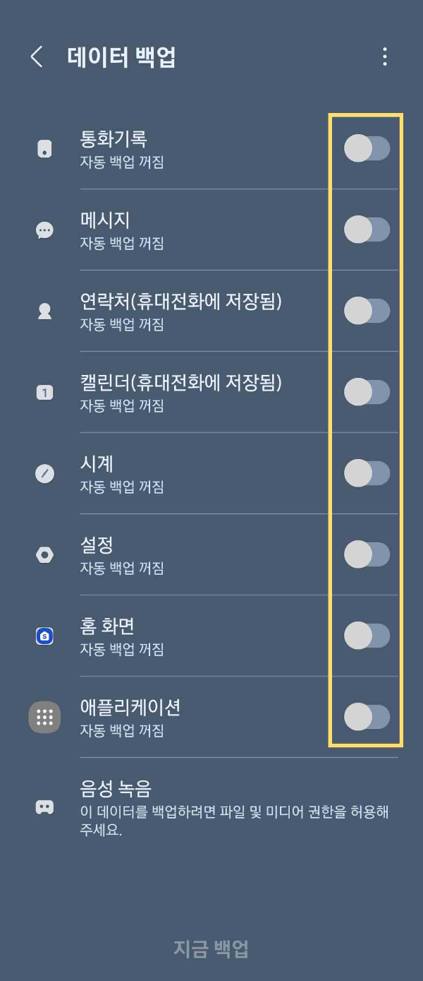 갤럭시 기종의 경우 삼성클라우드를 들어가 백업을 하게 되면 통화기록과 메시지, 연락처, 캘린더, 시계 설정, 홈화면, 애플리케이션 등의 전반적인 데이터를 백업할 수 있습니다. 토글을 오른쪽으로 활성화시켜 주면 데이터 백업이 설정됩니다.