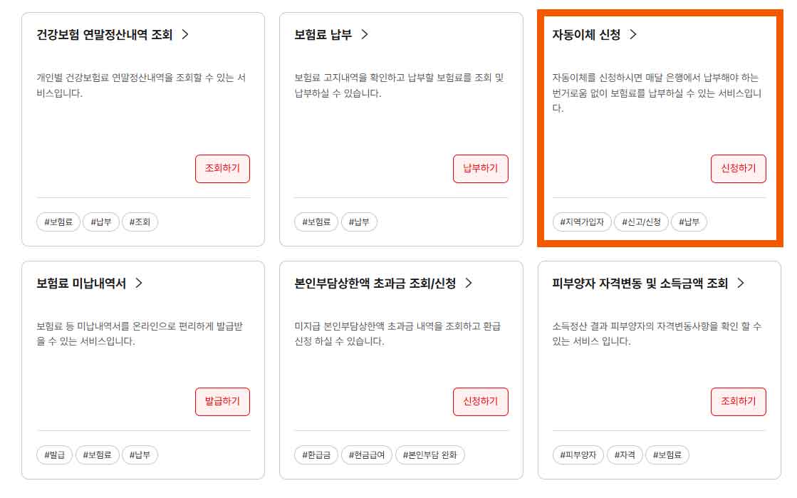 자동이체는 국민건강보험공단 홈페이지에서 간편하게 신청할 수 있습니다.