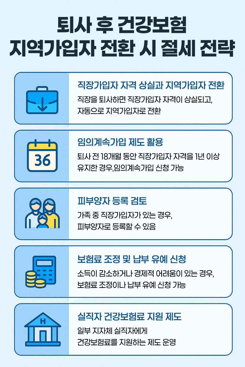 아래 인포그래픽으로 지역가입 전환 시 활용할 수 있는 핵심 제도 5가지를 빠르게 확인해 보세요.