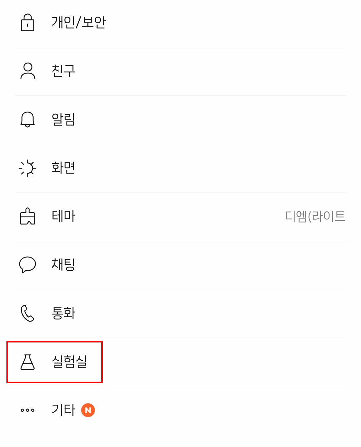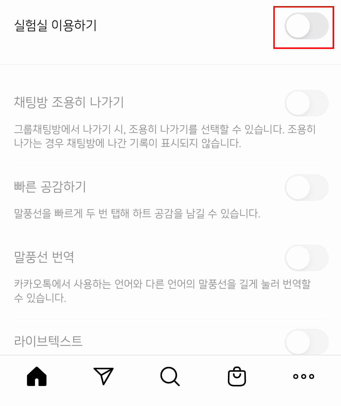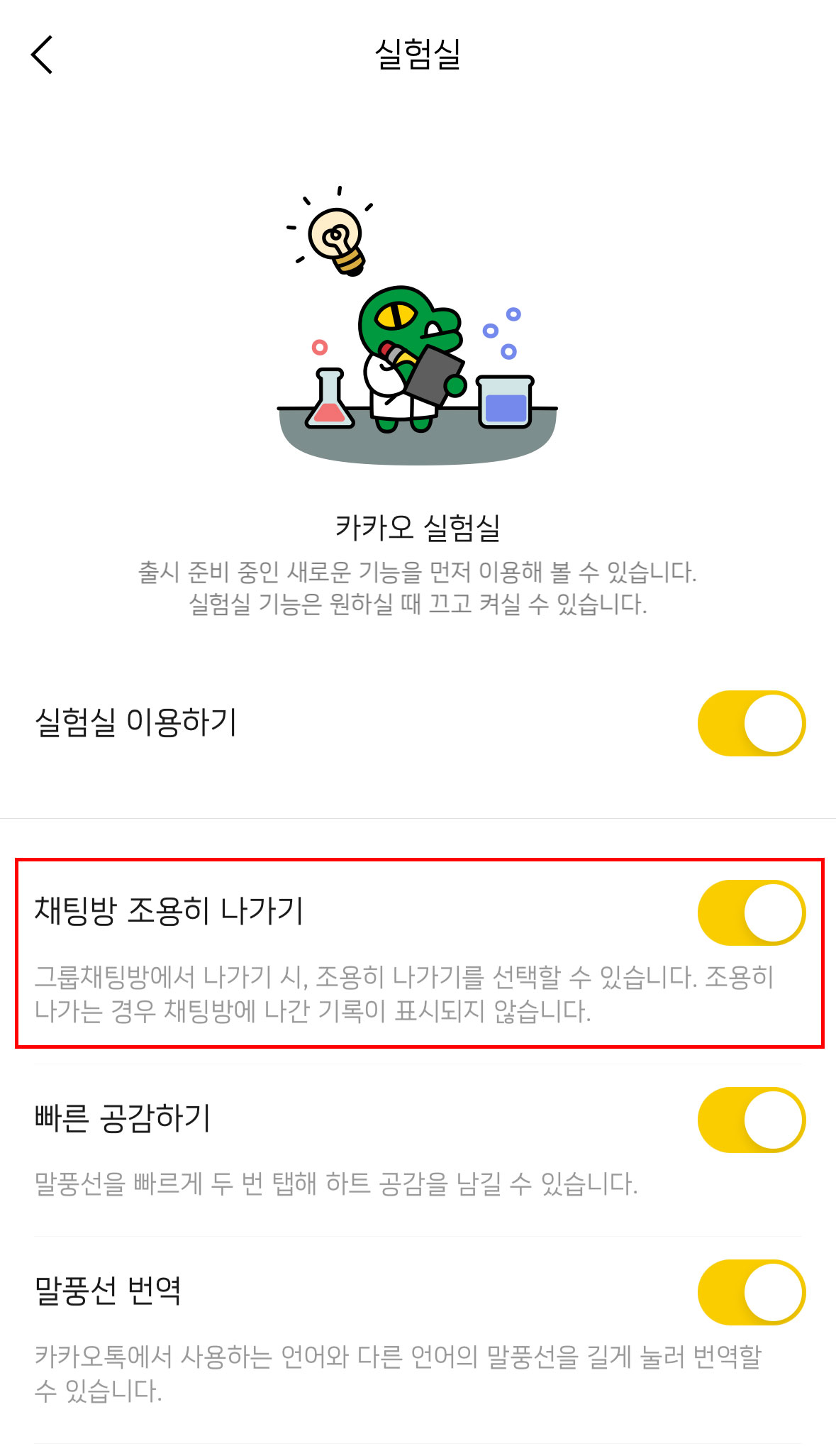 그런 다음 ‘실험실’탭을 누른 후 ‘채팅방 조용히 나가기’ 토글을 활성화해주세요.