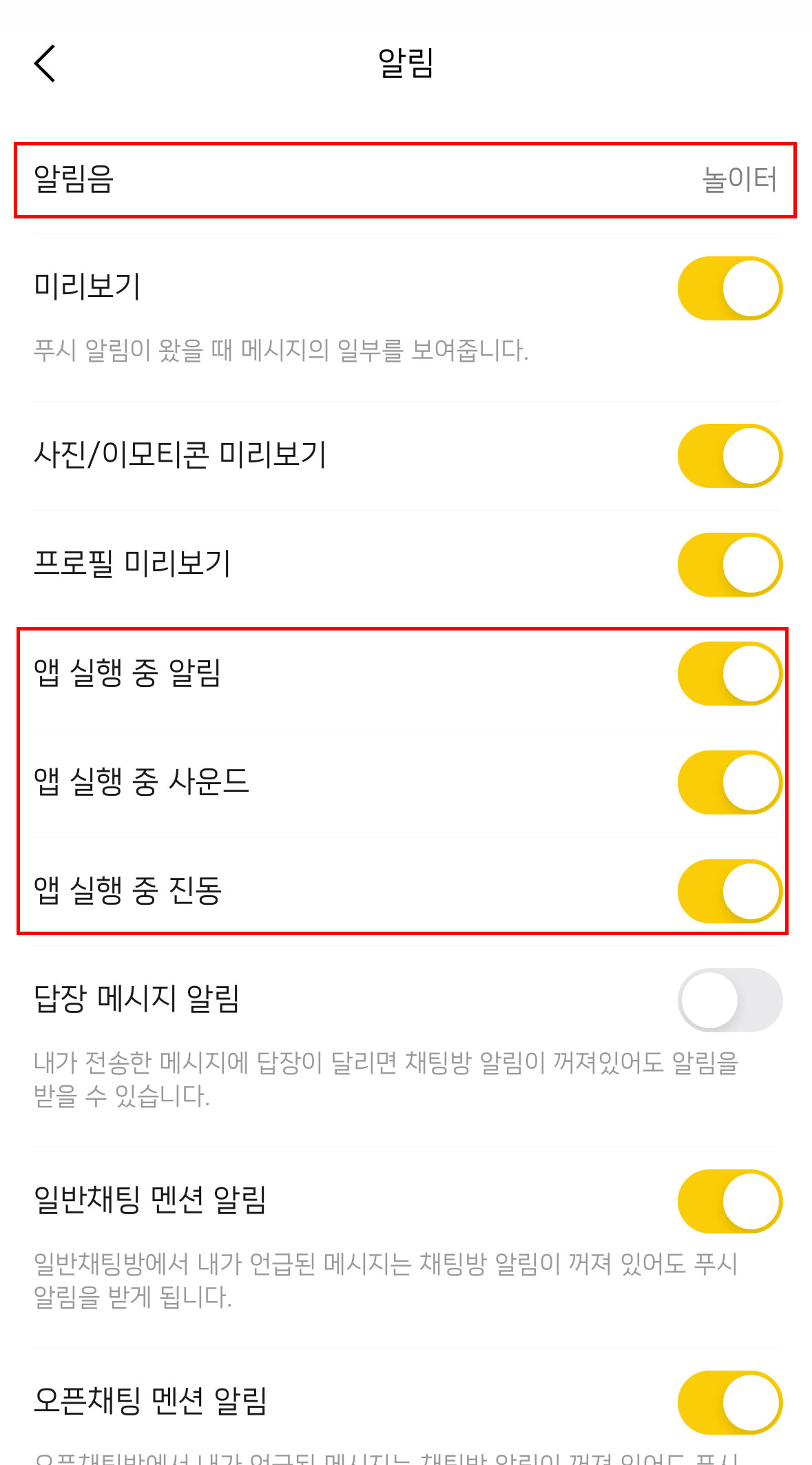 그리고 거기서 알림음을 무음으로 바꾸거나 앱 실행 중 알림 / 앱 실행 중 사운드 / 앱 실행 중 진동 의 활성화된 토글을 해제시켜주면 된답니다.