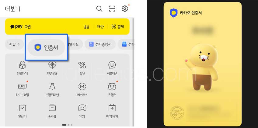 카카오톡- 하단 [더보기]- [인증서] 항목 클릭