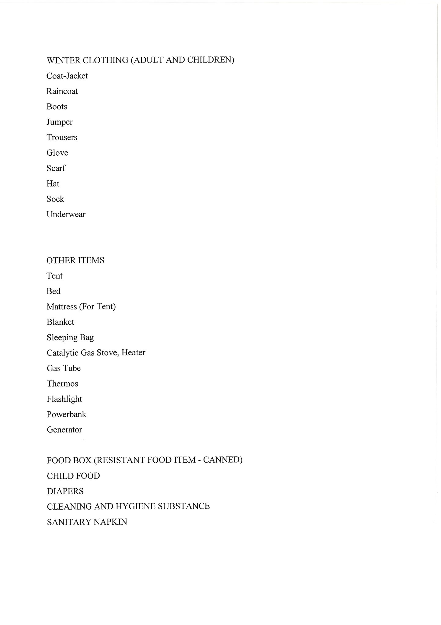 텐트, 매트리스(텐트용), 담요, 침낭, 보온병, 손전등, 식품(통조림 등), 유야식, 기저귀, 세척 및 위생용품, 생리대