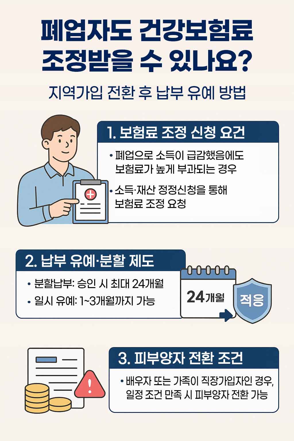 오늘은 폐업한 개인사업자가 건강보험 지역가입자로 전환된 이후 받을 수 있는 보험료 조정 및 납부 유예 방법에 대해 안내드립니다.