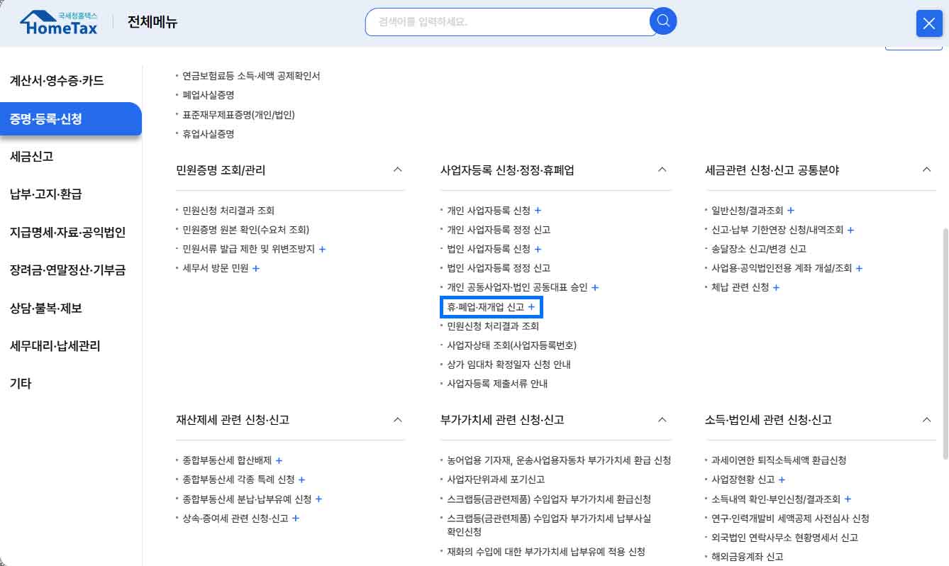홈택스 폐업신고 메뉴 화면