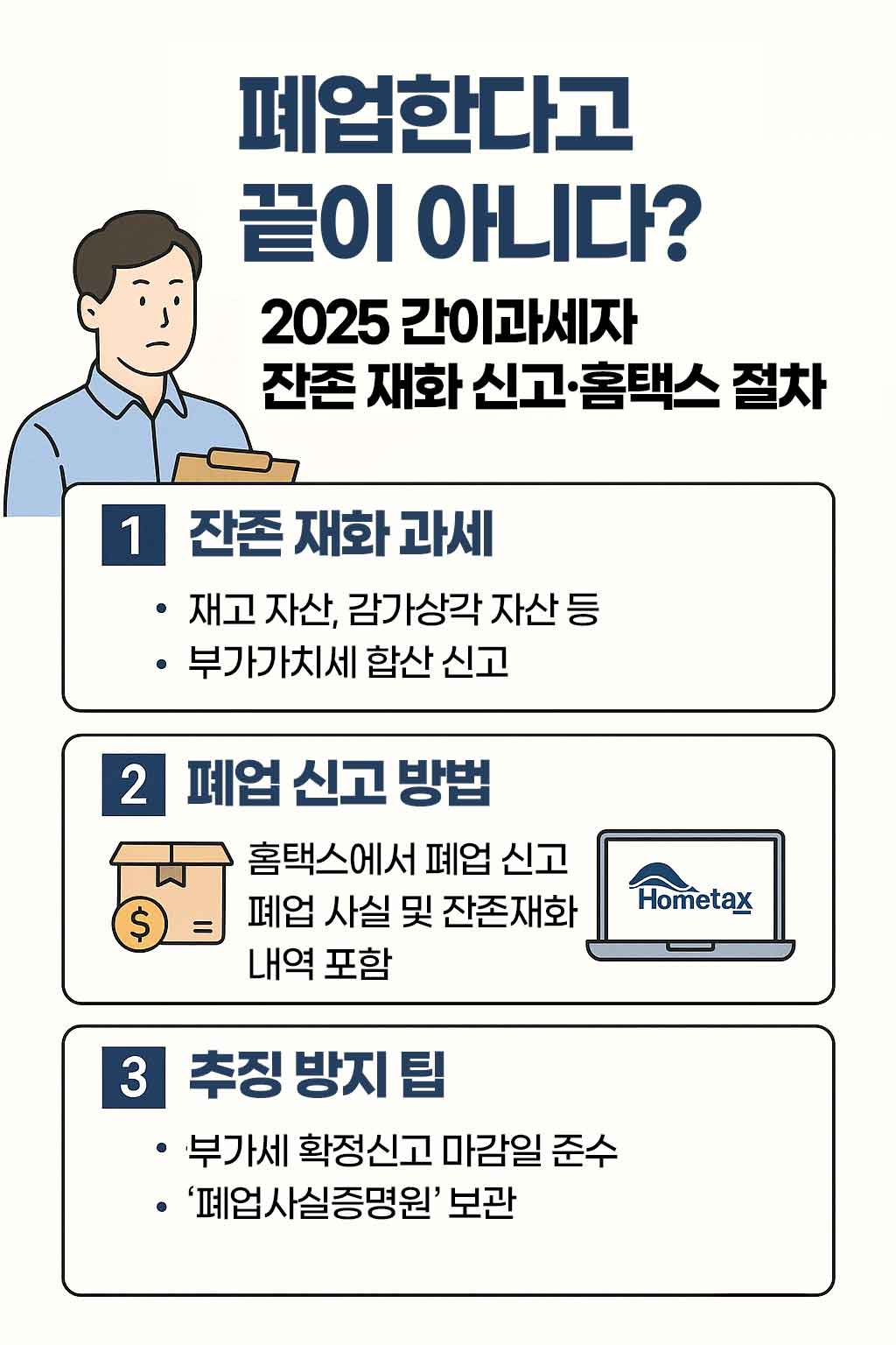 2025년에도 간이과세자 폐업 시에는 홈택스, 법령 기준, 제출 기한을 정확히 지켜 깔끔한 마무리를 하시길 바랍니다.