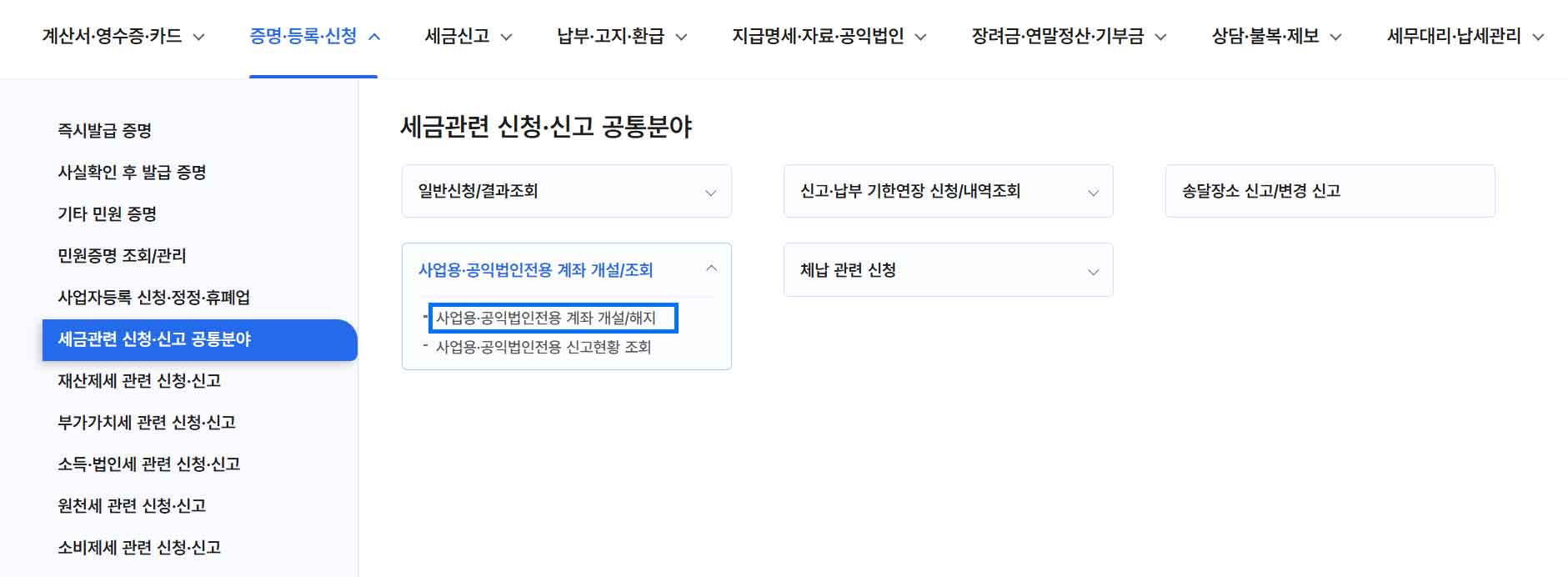 - [세금 관련신청·신고 공통분야] - [사업용(공익법인용) 계좌 개설관리] 클릭