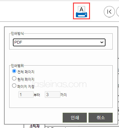 지급 명세서의 화면이 보이면 위의 프린트 아이콘을 누르고 인쇄버튼을 누르면 팝업 창이 뜰 텐데요.