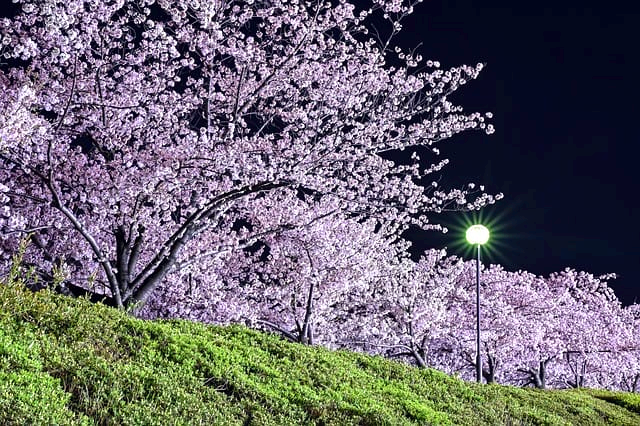 야간에도 화려한 벚꽃을 구경할 수 있습니다.
