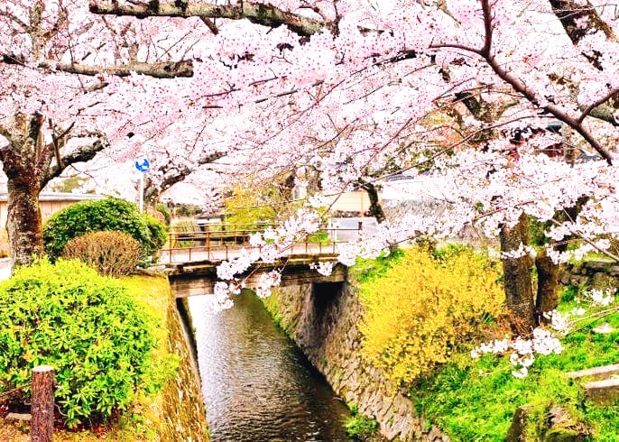 긴카구지에서 에이칸도까지 이어지는 길인데요. 운하를 따라서 심어진 약 400그루의 벚나무(왕벚나무, 오시마자쿠라, 야에자쿠라, 수양벚나무)를 간세츠 벚꽃이라고 부르는데요. 운하를 따라 늘어선 벚꽃과 작은 돌다리가 인상적입니다. 또한 동백, 개나리, 유채꽃 등 봄꽃들과 어우러저 봄을 만끽할 수 있다고 합니다. 벚꽃 절정 기간은 3월 말부터 4월 초까지입니다.