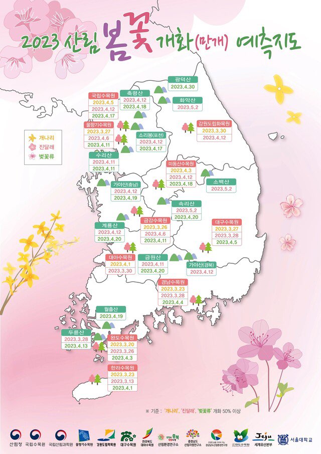 3일 산림청이 나들이를 계획 중인 여행객들을 위해 ‘2023년 봄꽃 개화 예측지도’를 발표했습니다.