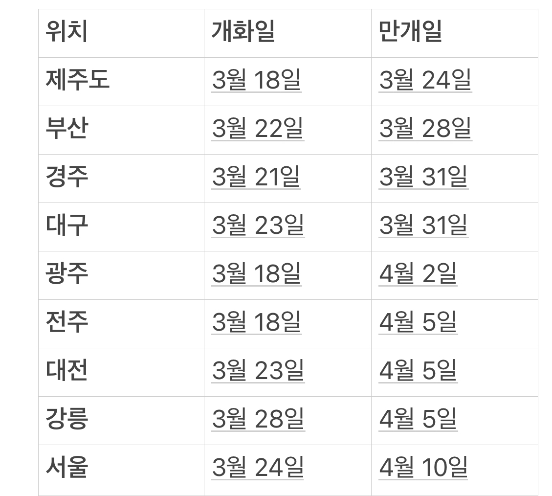 다음은 벚꽃 개화 시기 예측을 요약한 표이니 시기를 참고하여 방문하시면 좋을 것 같습니다..