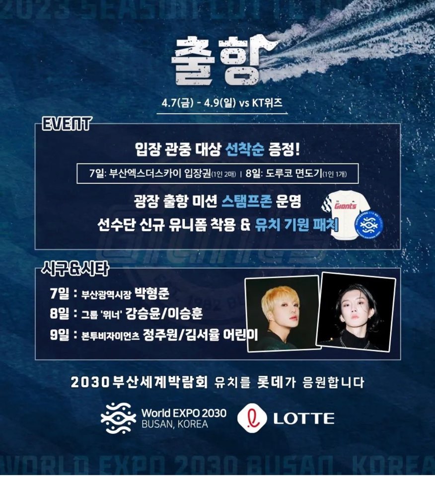 4월 9일 홈개막 마지막 날에는 부산시 초등학교 입학생 대상으로 진행되었던 '본투비 자이언츠' 정주원, 김서율 어린이가 시구자로 나선다고 합니다.