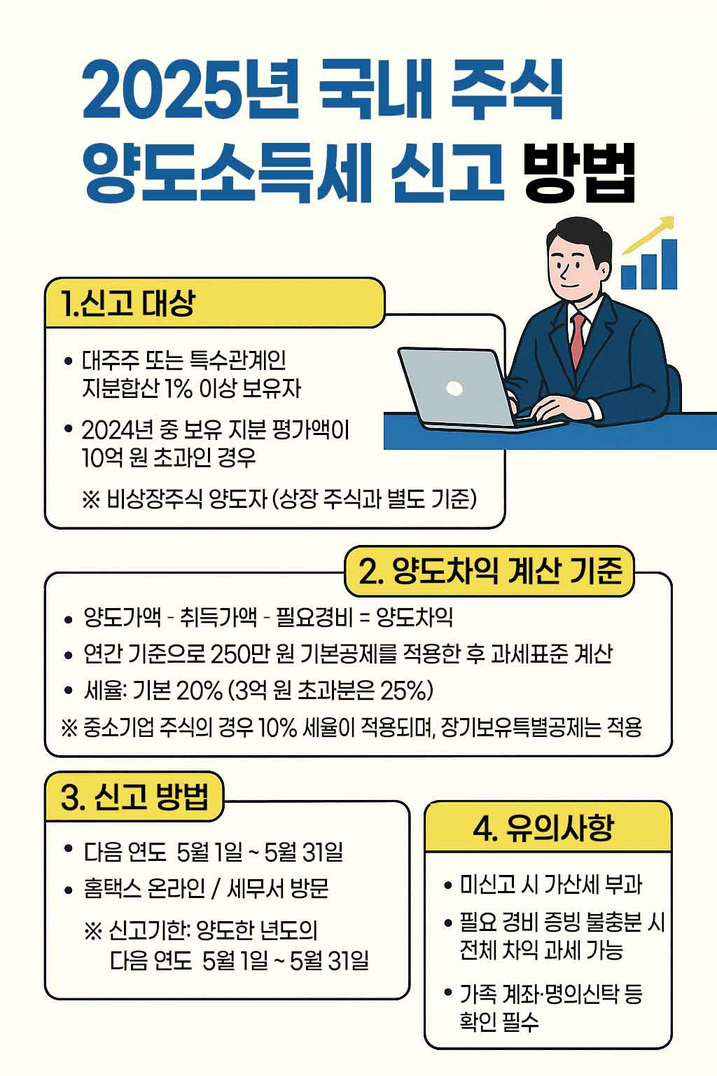 2025년 국내 주식 양도소득세 신고 방법 요약 인포그래픽