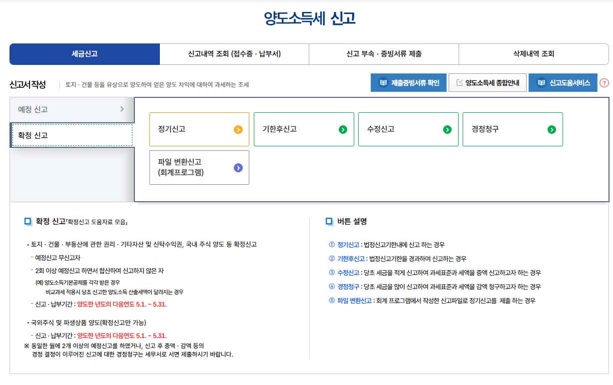 - 신고/납부 > 양도소득세 > 정기신고 선택