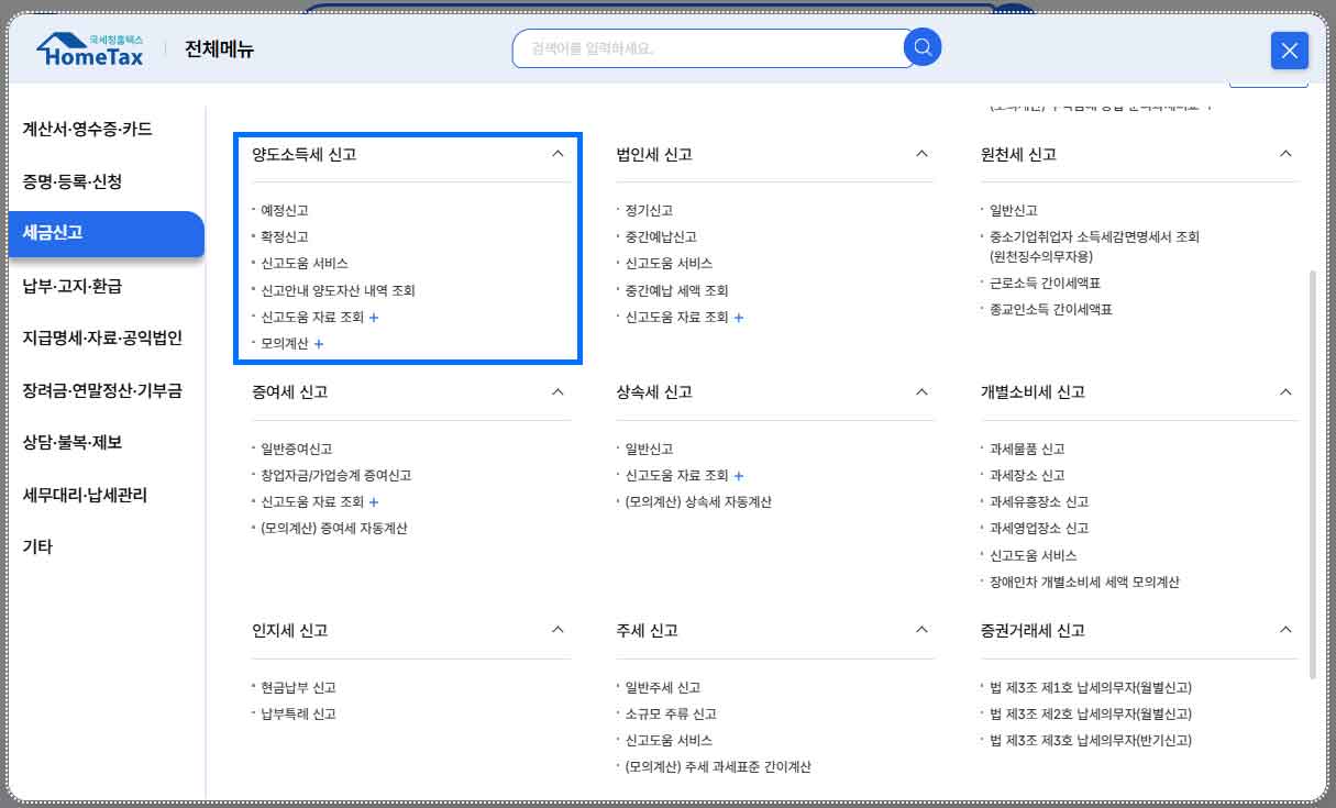 홈택스 내 양도소득세 신고 스크린샷 화면