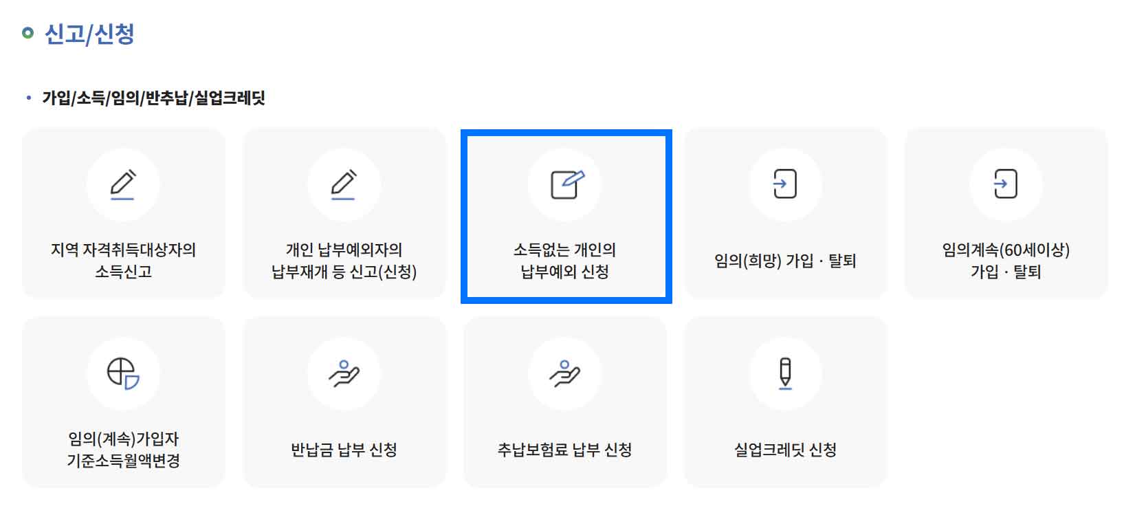 • 온라인 신청: 국민연금공단 홈페이지 접속 후 로그인   [전자민원 서비스] → [개인] → [신고·신청] [납부예외 신청]