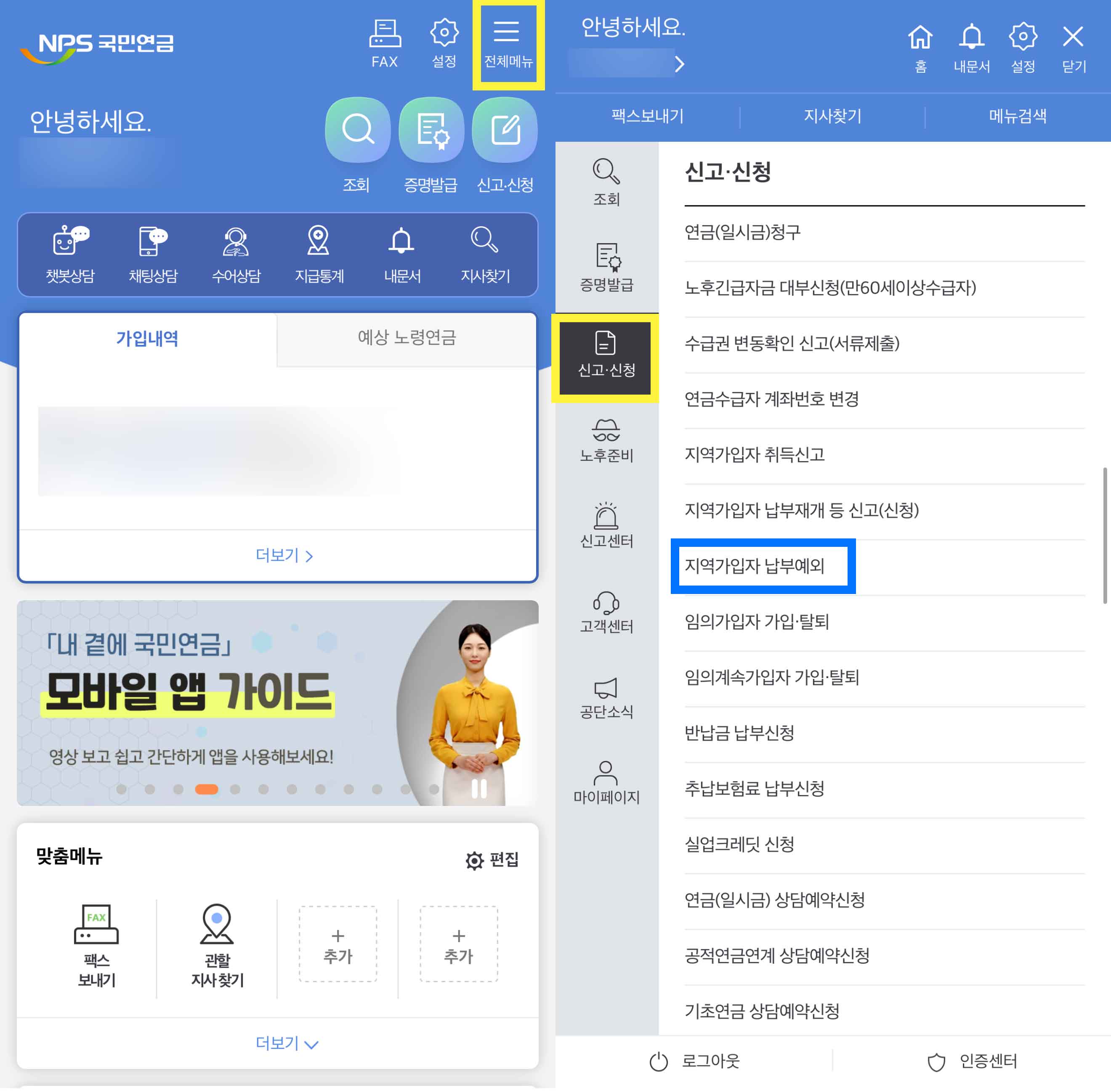 • 모바일 신청:'내 곁에 국민연금' 앱 접속 → 신고·신청    지역가입자 납부예외