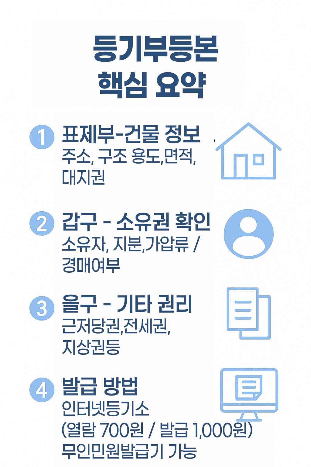 - 인터넷 등기소: 대법원 인터넷등기소에서 열람(700원), 발급(1,000원)