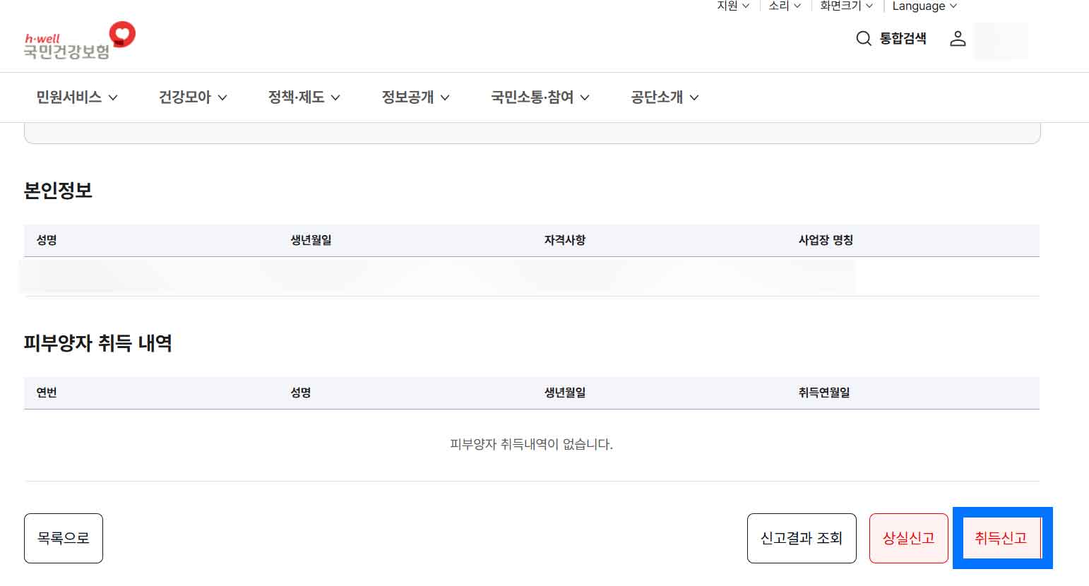 국민건강보험 홈페이지 피부양자 자격 취득 및 상실신고 페이지 스크린샷 화면