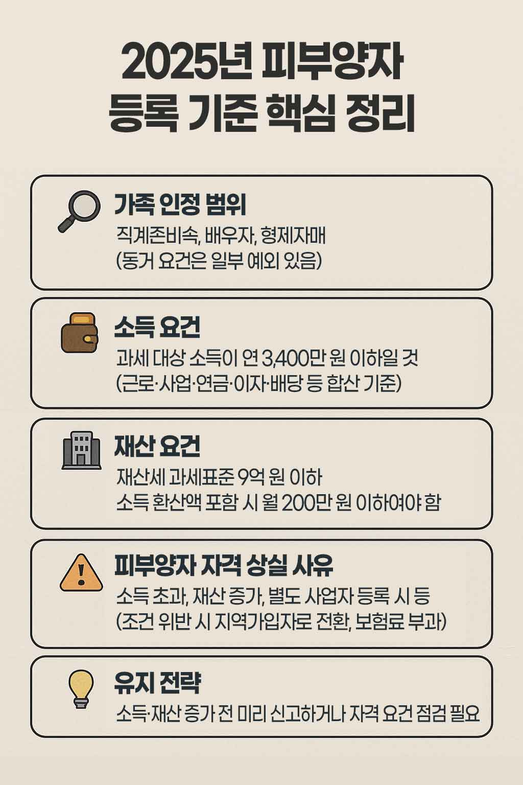 피부양자란 직장가입자의 배우자나 직계가족 등 경제적으로 독립되지 않은 가족을 말하며, 다음의 조건을 모두 충족해야 등록이 가능합니다.