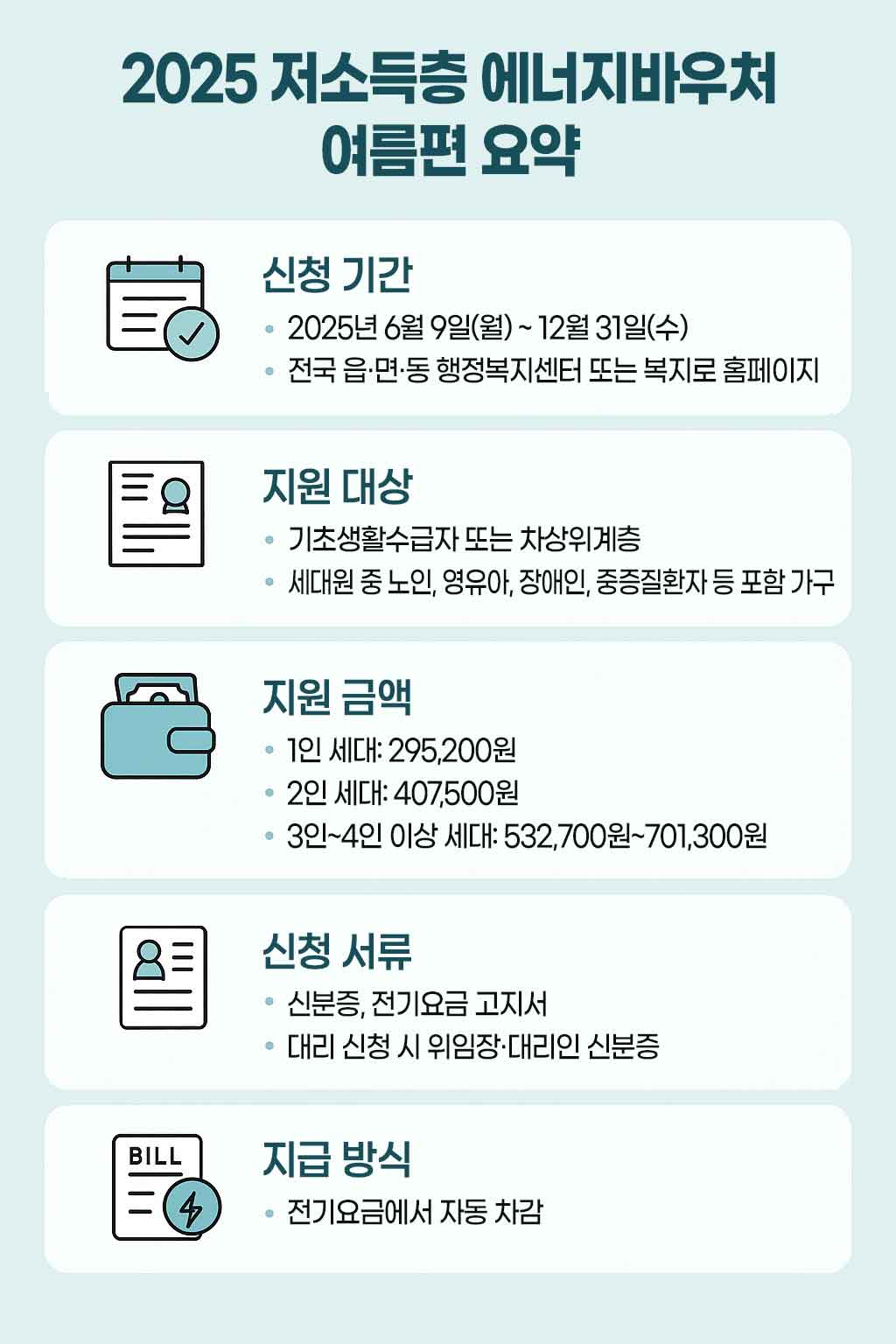 안녕하세요. 무더운 여름철, 전기요금 부담으로 고민하시는 분들을 위해 2025년 에너지바우처 여름편 신청 방법과 전기요금 할인 정보를 정리해 드리겠습니다. 정부의 지원 제도를 활용하여 시원하고 안전한 여름을 보내시길 바랍니다.