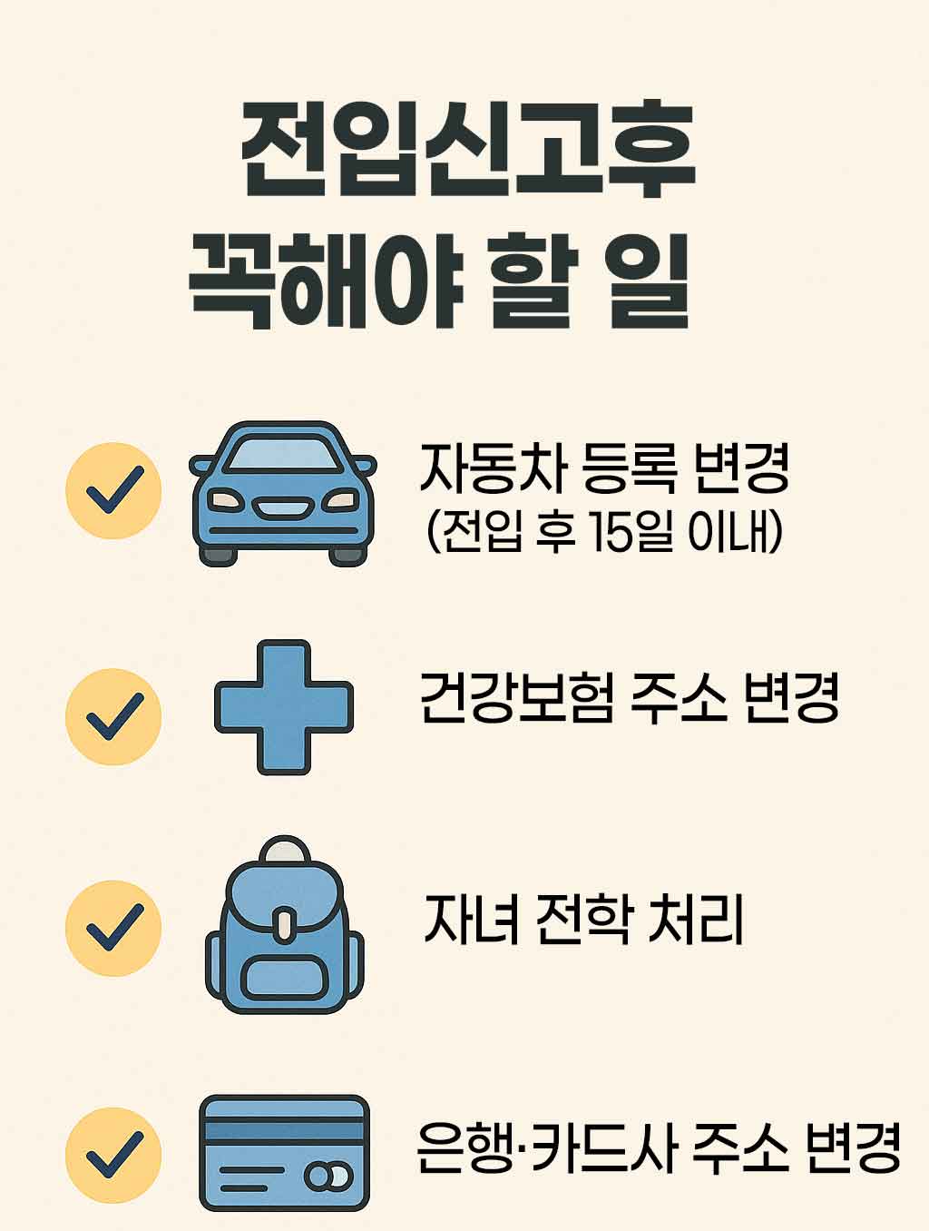 자동차 등록 변경, 건강보험 주소 변경, 자녀 전학 처리, 은행·카드사 주소 변경 등 전입신고 후 해야 할 일