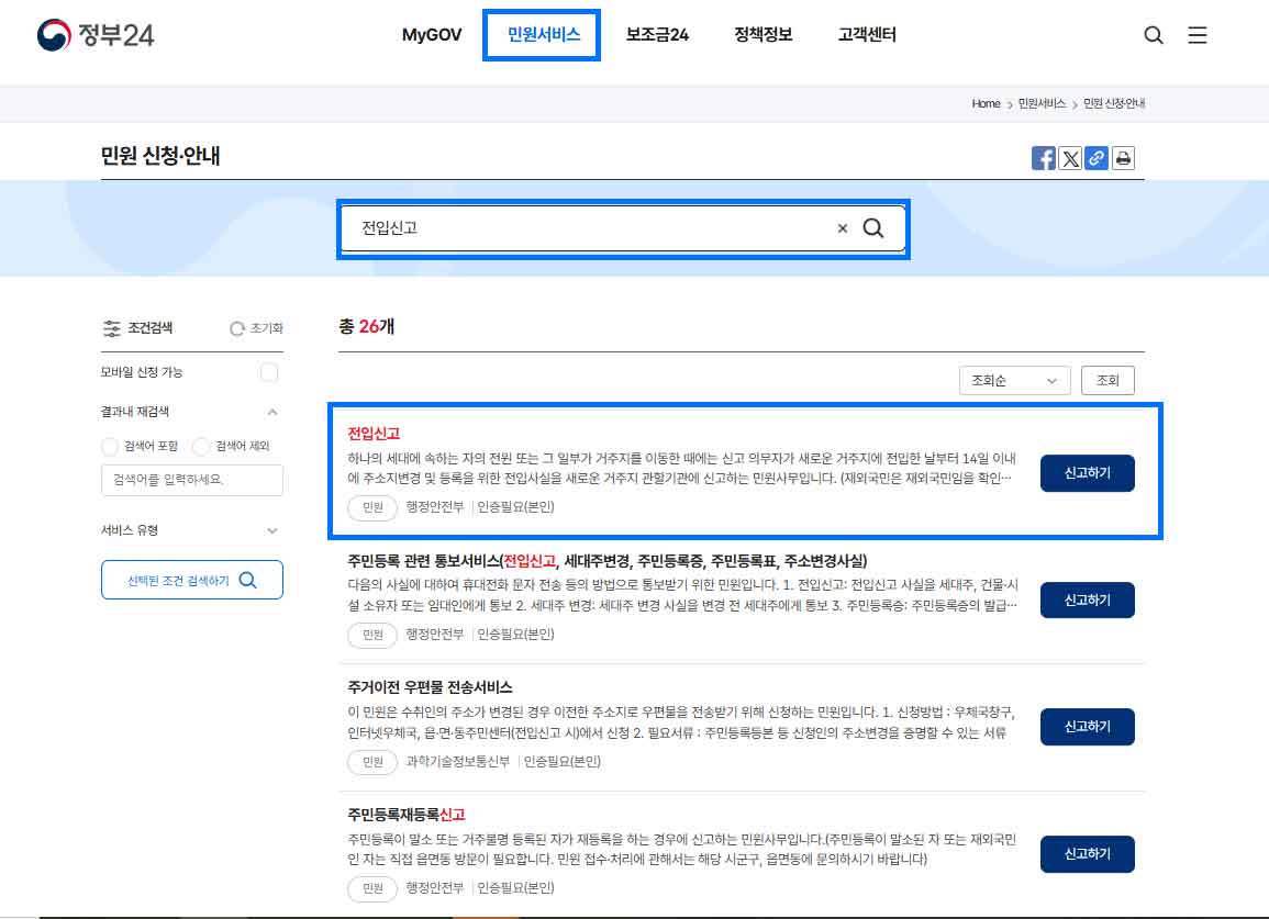 2. ‘전입신고’ 검색 또는 민원서비스 메뉴 클릭