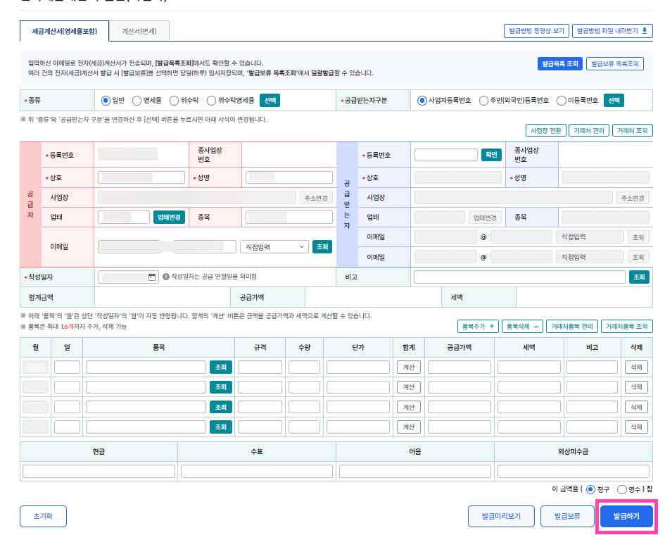 국세청 홈택스에 로그인 후 [전자세금계산서] 메뉴에서 사업자번호 입력 → 품목·공급가액 작성 후 발행할 수 있습니다.