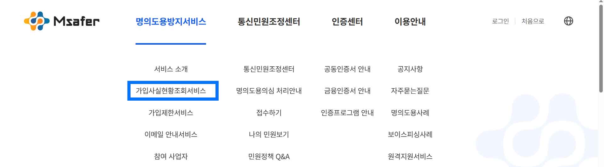 Msafer 홈페이지 [명의도용방지서비스] > [가입사실현황조회 서비스] 메뉴 화면