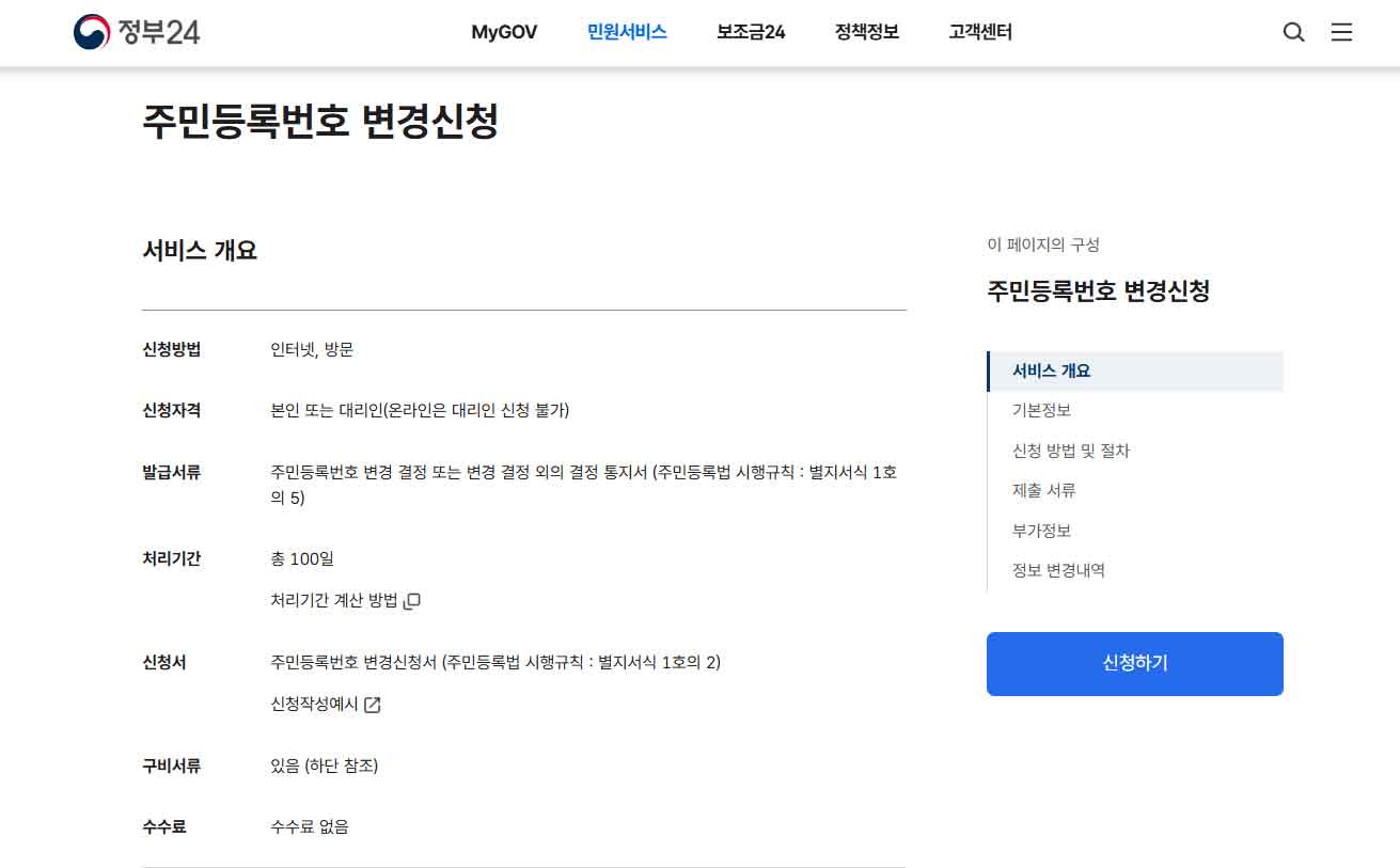 정부24 홈페이지 주민등록번호 변경신청 페이지 스크린샷 화면