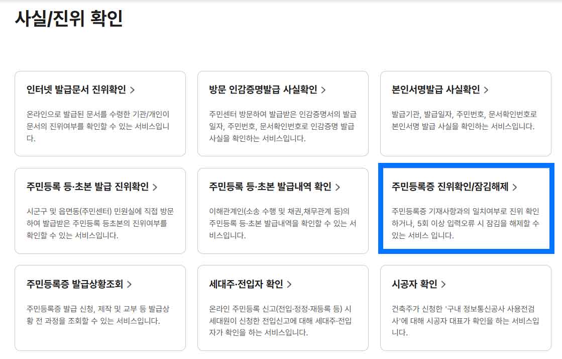 정부24 상단 메뉴 [사실/진위확인] > [주민등록증 진위확인/잠금해제] 화면